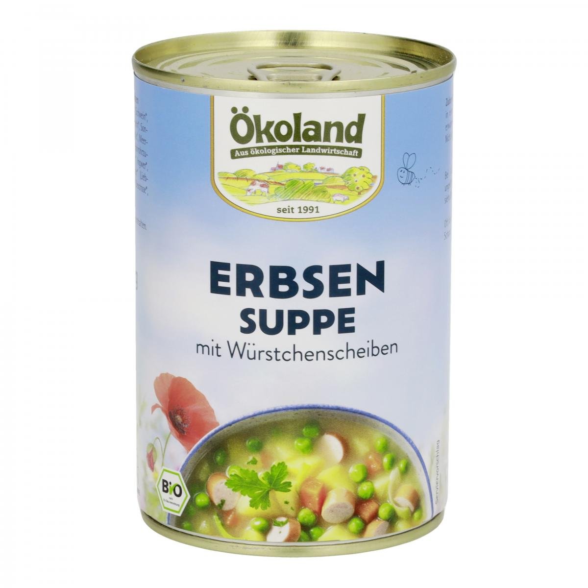 Erbsen gehören zu den ältesten Kulturpflanzen der Menschheit, sie haben ihren Ursprung im Orient. Erbsen sind ein ganz besonderes Gemüse – mit ihnen liefert unsere Ökoland Erbsensuppe wertvolles Eiweiß! Unsere Erbsen werden schonend zubereitet, gemeinsam mit typischem Suppengemüse und traditionellen Gewürzen perfekt abgeschmeckt. Und dann geben wir – für den herrlich herzhaften Geschmack – unsere original Ökoland Würstchenscheiben dazu!