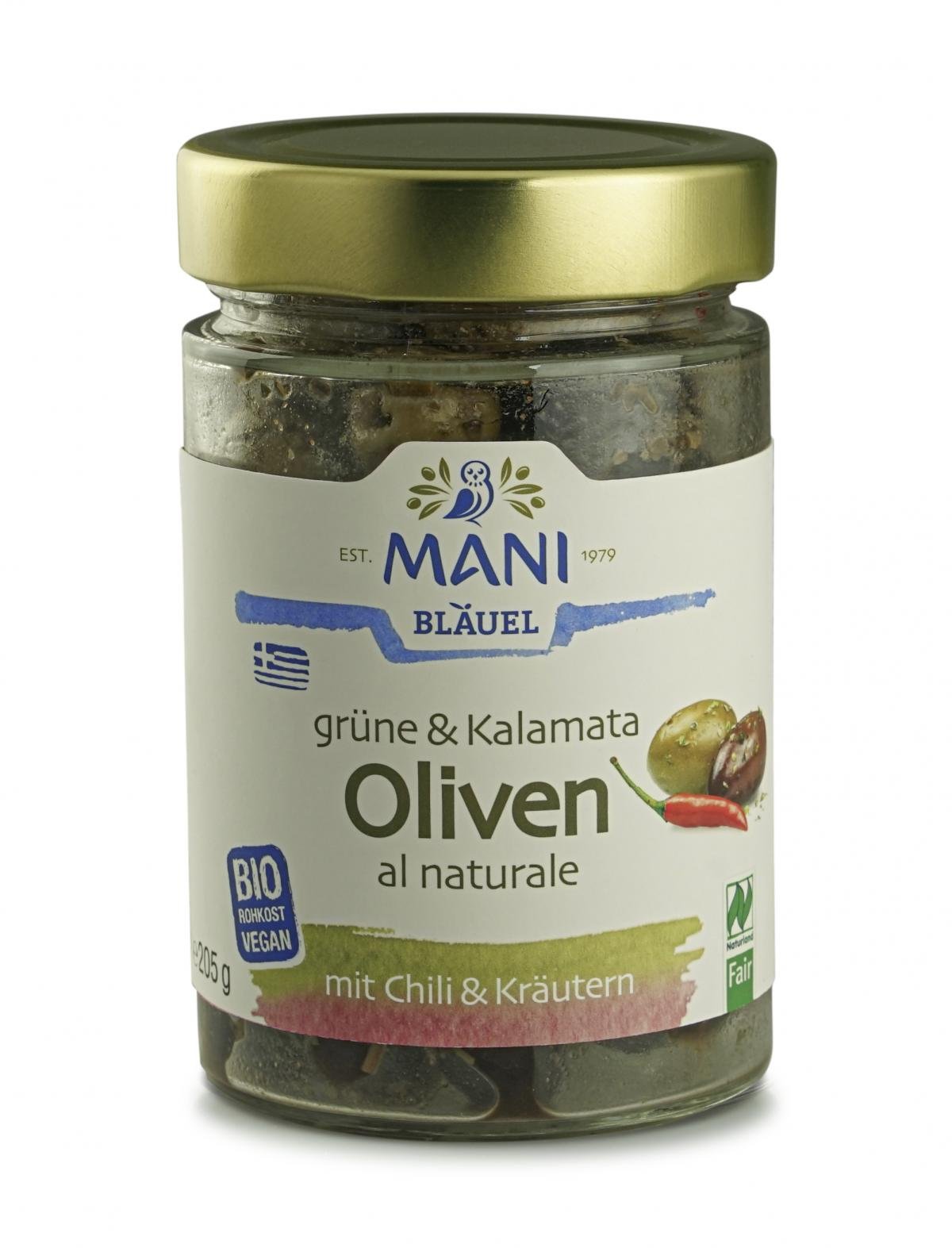 Grüne u Kalamata Oliven Chili u Kräutern mit Stein, 205g