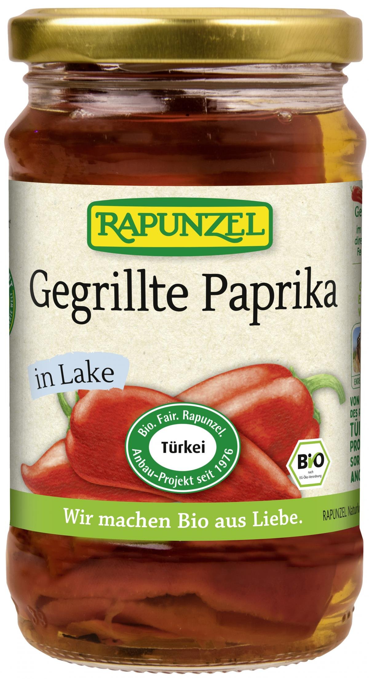 Sonnengereifte Paprika der Sorte 'Capia' aus dem Rapunzel Türkei-Projekt. Die von Hand geernteten Paprikas werden erntefrisch verarbeitet und in einem speziellen Ofen direkt über dem Feuer gegrillt. Das verleiht ihnen den typischen Grillgeschmack. Die Paprikas schmecken aromatisch-fruchtig und sind vielseitig verwendbar.