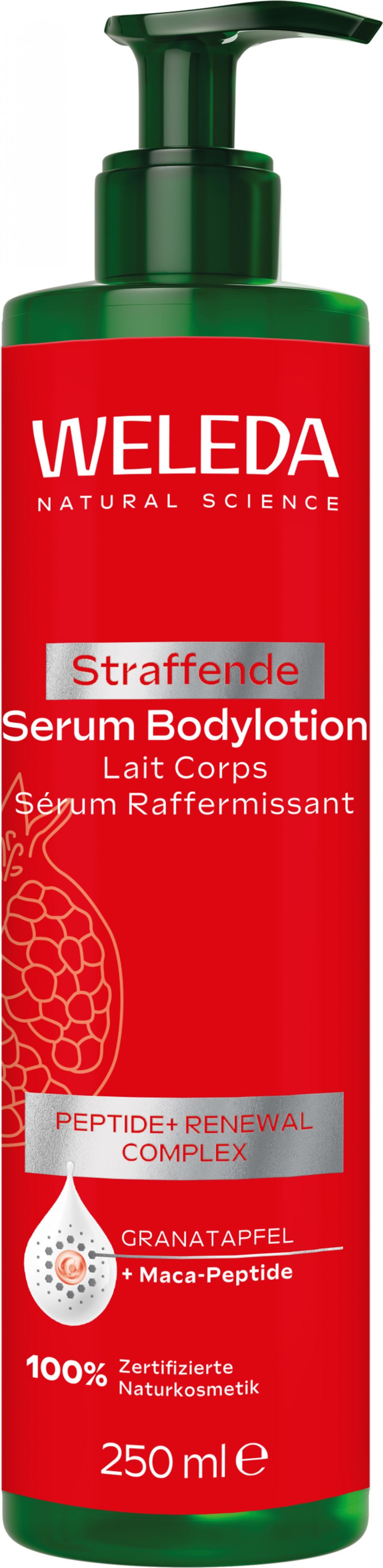 Die schnell einziehende Serum Bodylotion vereint die Inhaltsstoffe eines Serums mit der Pflege einer Lotion. Sie enthält den PEPTIDE+ RENEWAL COMPLEX, aus Bio-Granatapfelsamenöl und Maca-Peptiden. Die einzigartige Rezeptur strafft und regeneriert anspruchsvolle Haut, wirkt antioxidativ und unterstützt die Zellerneuerung.